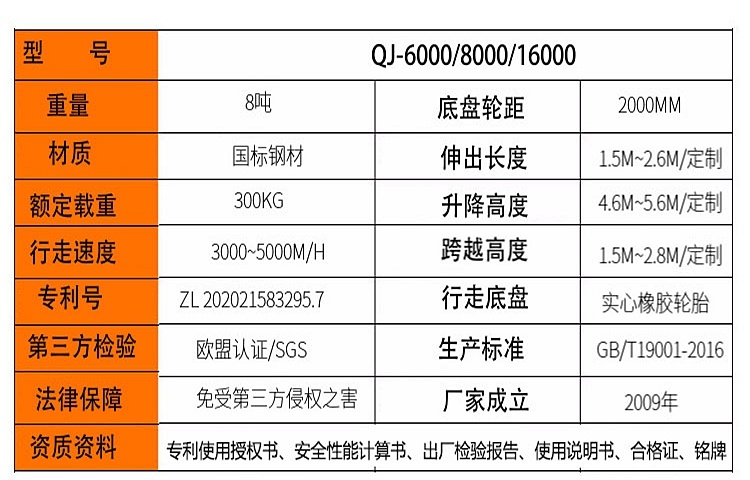 升降高度可(ke)達:5~6米;實心輪胎(tāi)配置底盤;自帶(dài)配重;