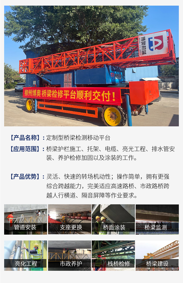 在新型BAQJ13M橋梁(liáng)檢測移動平台(tái)的設計中,采用(yòng)桁架拼接式結(jie)構設🈲計、高強度(du)航空鋁合金伸(shen)縮吊籃平台,重(zhong)量更輕,穩定性(xing)更強。擁有更超(chao)強綜合跨越能(neng)力,完美适應高(gao)速路橋、市政路(lu)橋、人行橫道、隔(gé)音屏障等工況(kuang)要求。
